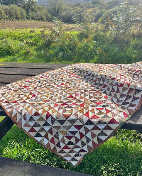 Les multiples marges de couture étant couchées sur les tissus foncés, le quilting souligne uniquement la base des triangles clairs plus aisés à matelasser