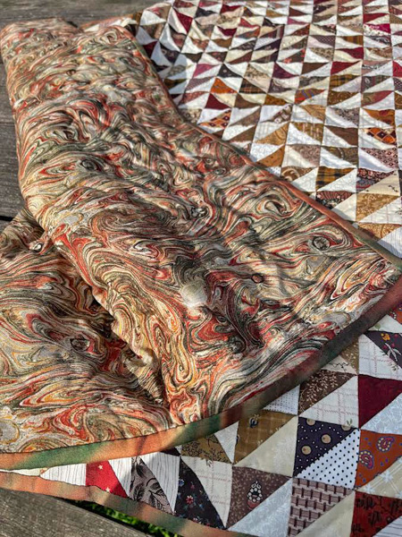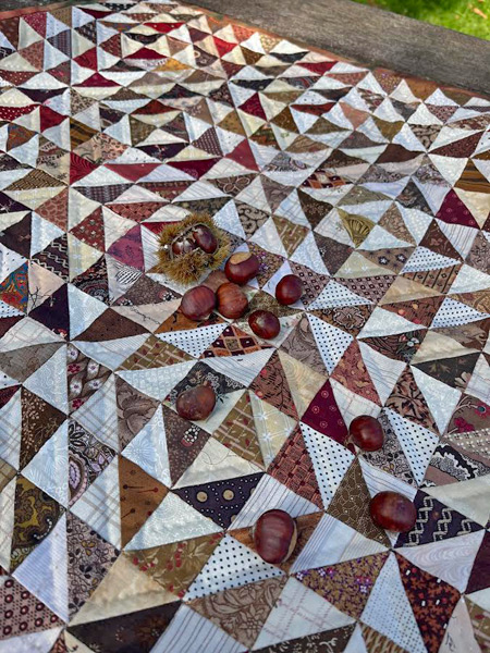 Les tissus choisis pour cet ouvrage inspirés par les couleurs automnales (pour lesquelles j’ai un grand faible !) furent sélectionnés parmi différents bruns, beaucoup de beiges clairs et foncés, ainsi que des rouges soutenus