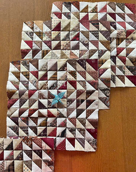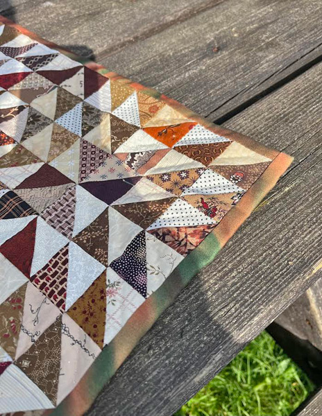 Je n’ai pas trouvé nécessaire d’encadrer l’ouvrage avec une large bordure, les quilts ordinaires de l’époque n’en comportaient généralement pas, faute de tissu suffisant d’un seul tenant