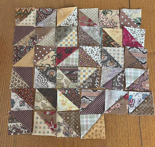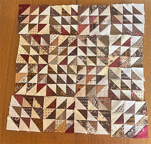 Un triangle rectangle comme seul gabarit et des blocs montés par 9 carrés formés de 2 triangles dont le sens se trouve inversé à chaque rang