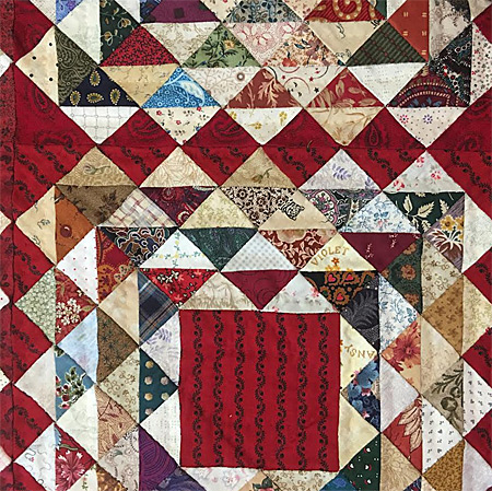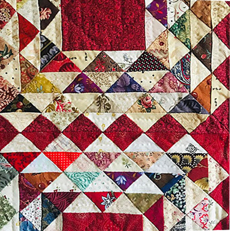 Toutes les couleurs disparates ainsi réunies demandaient une alternance de ces triangles avec des teintes claires pour éviter le côté mélange peu harmonieux si souvent observé dans les Scraps Quilts