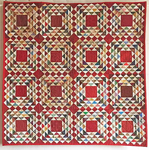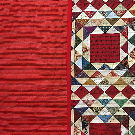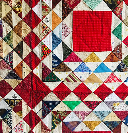 Le même tissu rouge des grands carrés se décline dans les petits triangles entourant chaque bloc