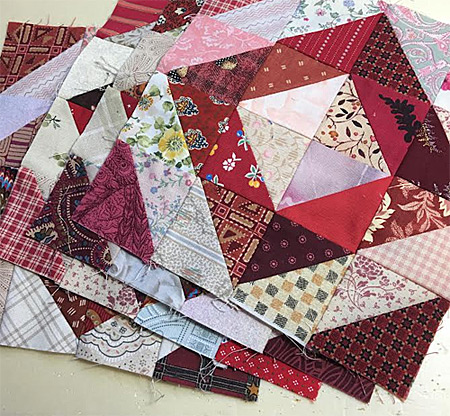 J’avais rangé, après la confection de l’ouvrage, dans une boîte, tous les triangles rouges découpés en trop … qui, une fois la boîte rouverte, me rappelèrent qu’ils pouvaient être utiles pour un nouveau quilt !