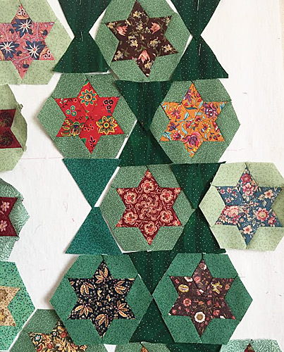 Je choisis des verts différents unis et imprimés et pour mes « fleurs » étoiles des tissus fleuris