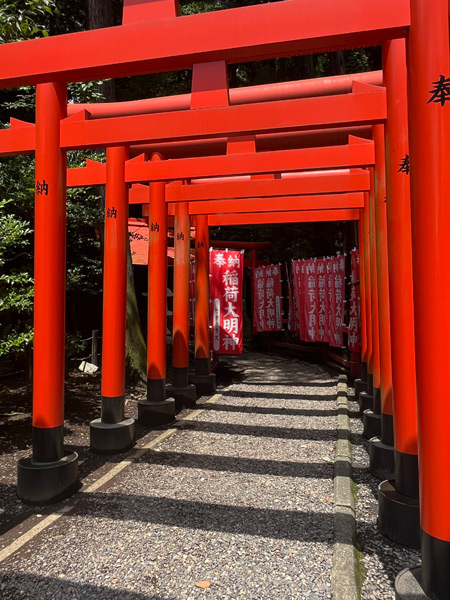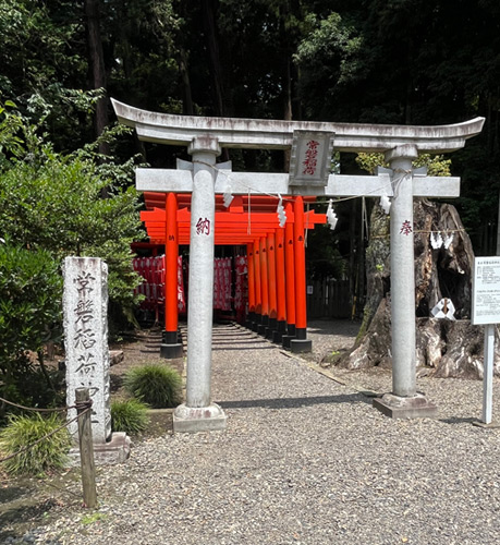 Dans l’enceinte du Tokiwa jinja, une allée de Torii rouges signale que le sanctuaire est aussi dédié à Inari sama, le Kami de l’agriculture