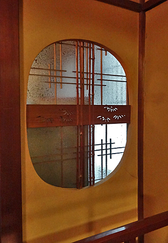 Fenêtre décorée d’un treillis de fines baguettes de bambou