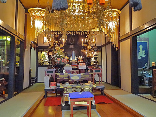 D’autres statues de taille plus modeste, effigies du Bouddha et des patriarches de l’école Jôdô shû ont aussi leurs autels où ils reçoivent diverses offrandes