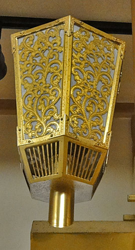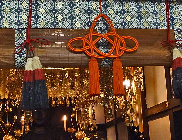 Rideau relevé par d’élégantes décorations rituelles au-devant de l’autel