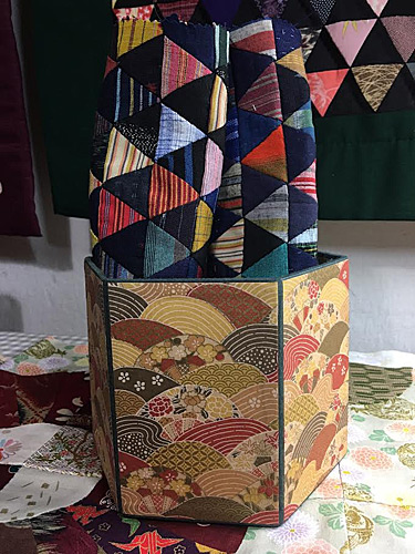 Boîte recouvert de papier Washi faite par mon mari pour y glisser mes petits rouleaux de tissus