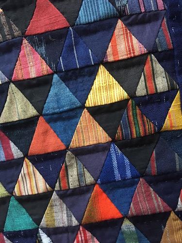 Comme ces tissus s’effilochent beaucoup en général, sur de très petites pièces la difficulté s’en trouve multipliée, les marges de couture ne pouvant qu’être étroites afin de garder les angles des triangles nets