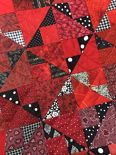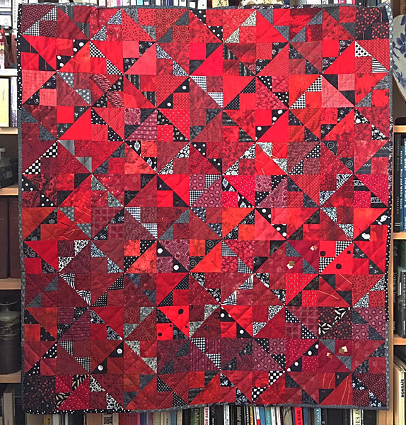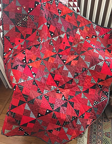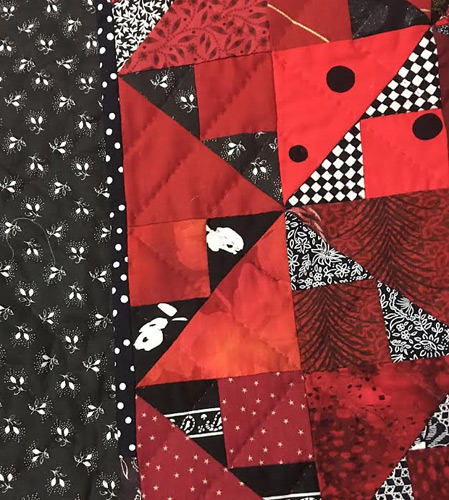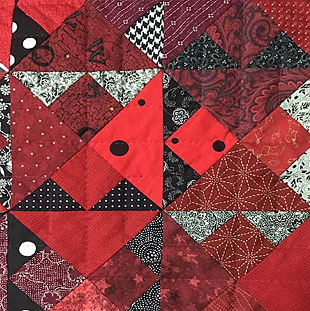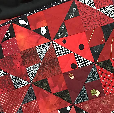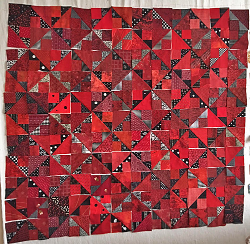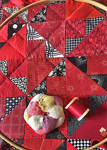Chaque tissu rouge n’est employé que deux fois et dans des combinaisons différentes avec les triangles noirs