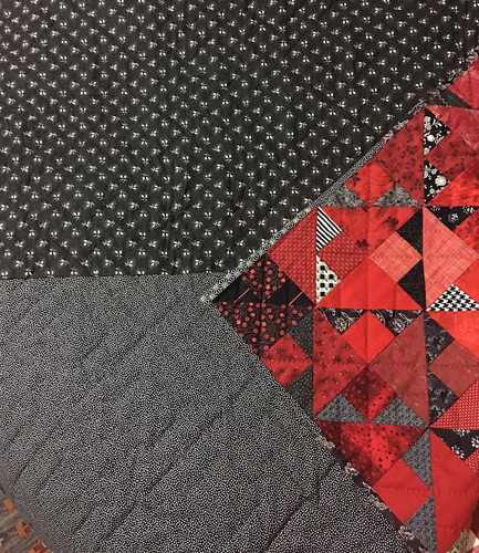 Les lignes de quilting en fil rouge traversent chaque bloc en formant sur l’envers le motif du carré dans le carré