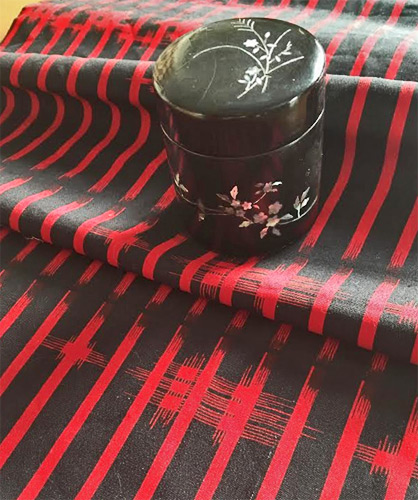 C’est la couleur audacieuse d’un lé d’une soie pour kimono imprimée de lignes rouges façon Ikat sur un fond noir qui m’a fourni mon inspiration