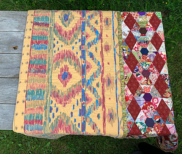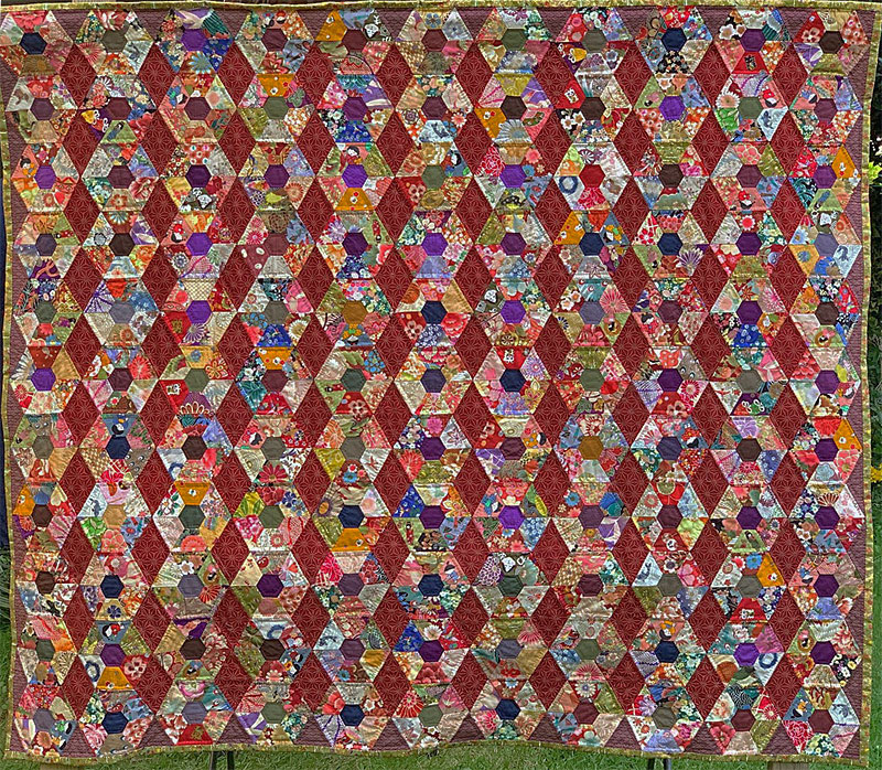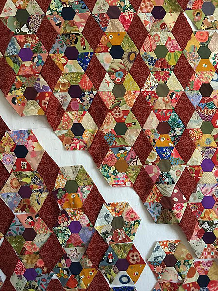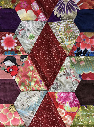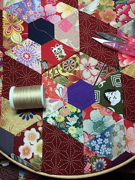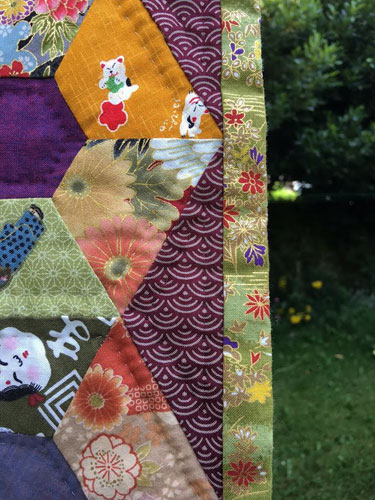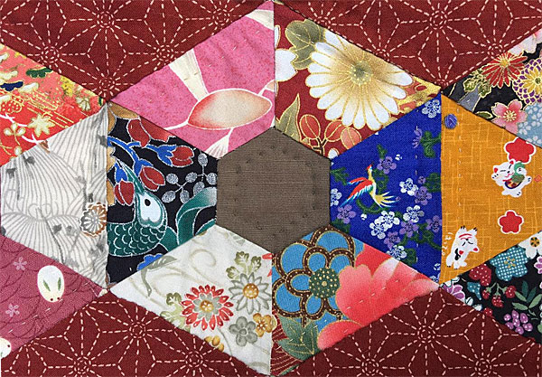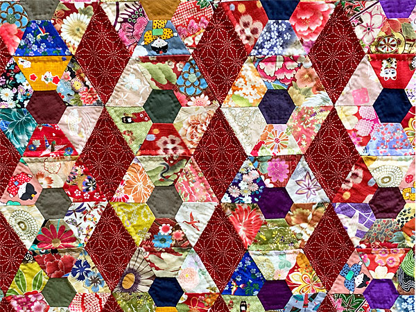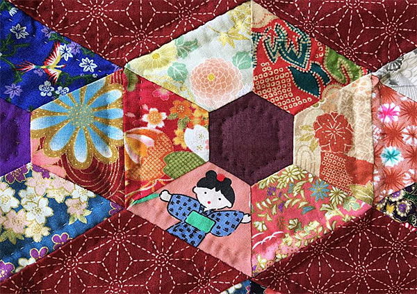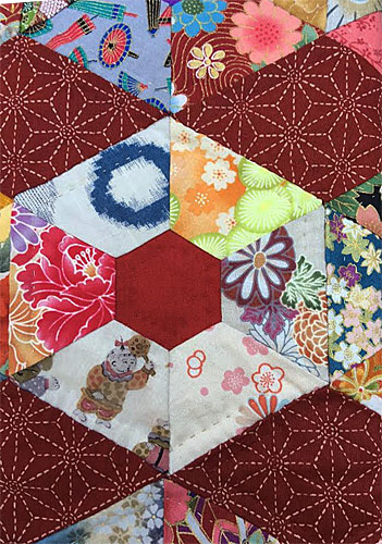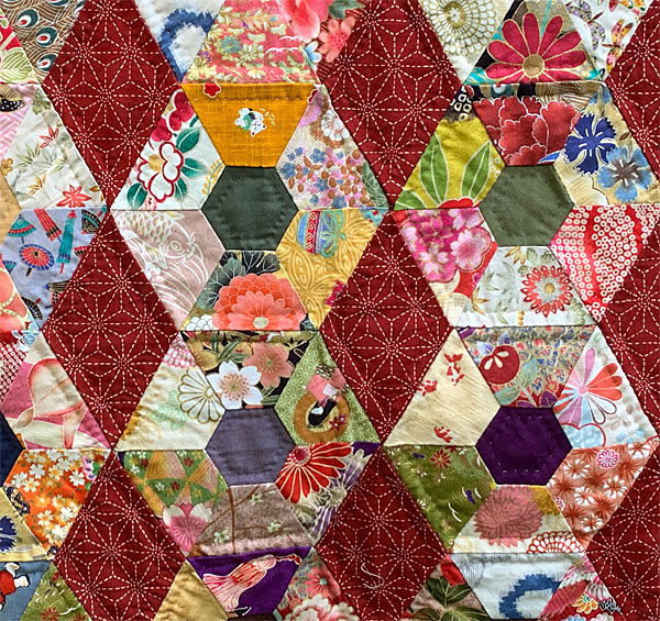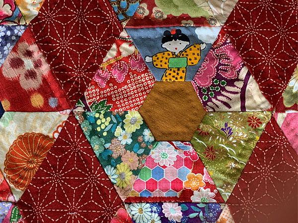 Le quilting en fils de différentes couleurs souligne les hexagones des centres et le tour de chaque bloc